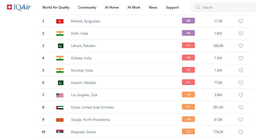 В рейтинге крупнейших городов мира по качеству воздуха World Air Quality Бишкек находится на первом месте.