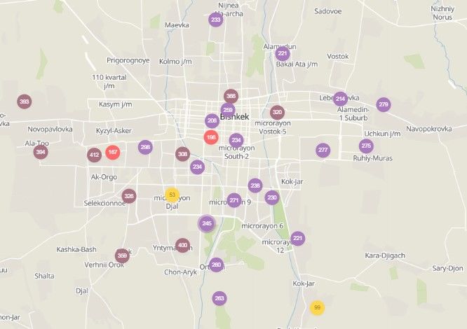 Общественный фонд «Институт экологических решений» установил датчики в столице и пригороде. На карте можно увидеть среднее значение AQI в разных районах Бишкека. Его обновляют ежечасно.