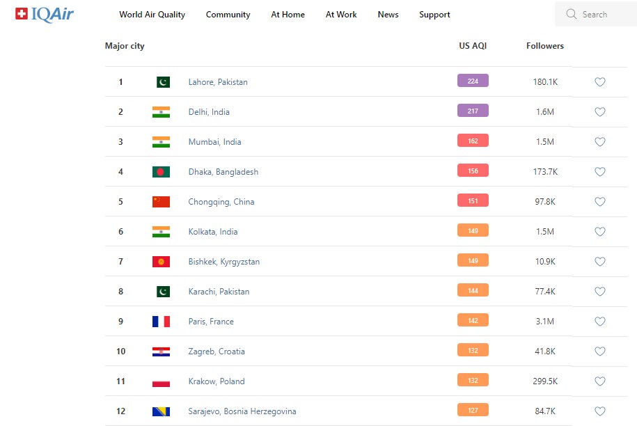 В рейтинге крупнейших городов мира по качеству воздуха World Air Quality Бишкек находится на седьмом месте.