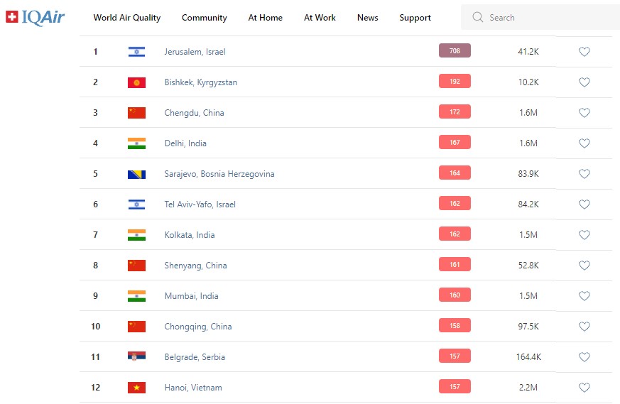 В рейтинге крупнейших городов мира по качеству воздуха World Air Quality Бишкек находится на втором месте.