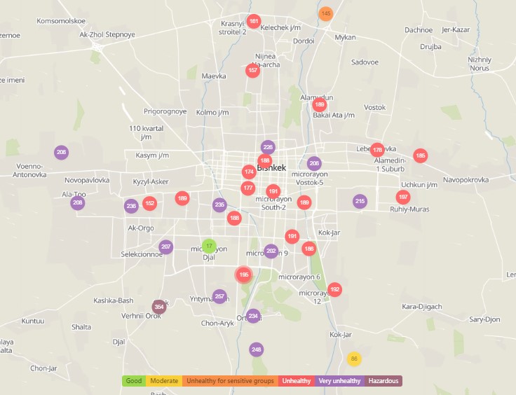 Общественный фонд «Институт экологических решений» установил датчики в столице и пригороде. На карте можно увидеть среднее значение AQI в разных районах Бишкека. Его обновляют ежечасно.