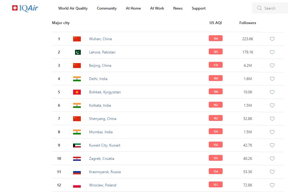 В рейтинге крупнейших городов мира по качеству воздуха World Air Quality Бишкек поднялся на пятое место.