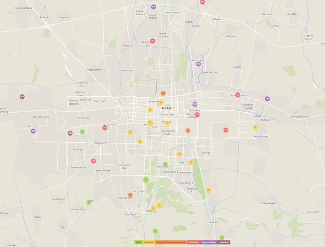 Общественный фонд «Институт экологических решений» установил датчики в столице и пригороде. На карте можно увидеть среднее значение AQI в разных районах Бишкека. Его обновляют ежечасно.