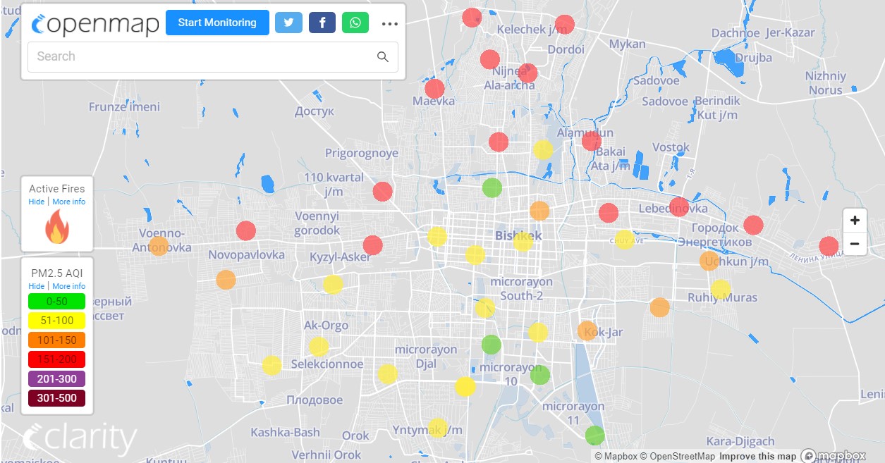 Посольство США в Кыргызстане также установило датчик. Информация обновляется каждый час. Индекс качества воздуха в районе дипломатической миссии — 54 (AQI).