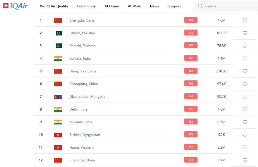 В рейтинге крупнейших городов мира по качеству воздуха World Air Quality Бишкек поднялся на 10-е место.