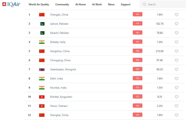 В 18.00 статус города отмечен как «нездоровый». Индекс качества воздуха, по данным сайта, составляет 153 (AQI).