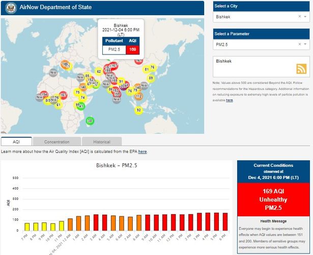 Посольство США в Кыргызстане также установило датчик. Информация обновляется каждый час. Индекс качества воздуха в районе дипломатической миссии — 169 (AQI).