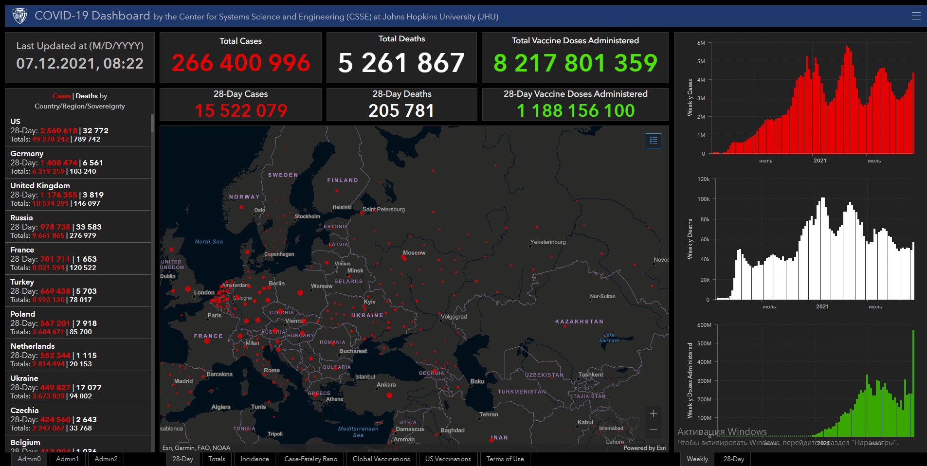 Всего в мире коронавирусом заразились 266 миллионов 400 тысяч 996 человек. Больше всего зараженных в США (49 миллионов 278 тысяч 242), Индии (34 миллиона 641 тысяча 561), Бразилии (22 миллиона 147 тысяч 476), Франции (8 миллионов 21 тысяча 594), Великобритании (10 миллионов 574 тысячи 291), России (9 миллионов 661 тысяча 865), Турции (8 миллионов 923 тысячи 120), Аргентине (5 миллионов 343 тысячи 153), Иране (6 миллионов 137 тысяч 821), Колумбии (5 миллионов 82 тысячи 762), Испании (5 миллионов 202 тысячи 958), Италии (5 миллионов 118 тысяч 576) и Германии (6 миллионов 219 тысяч 259).