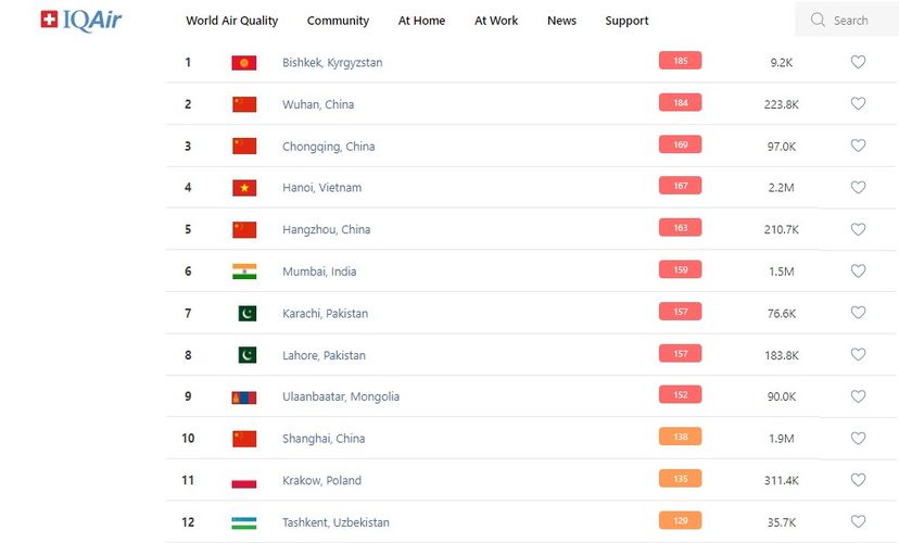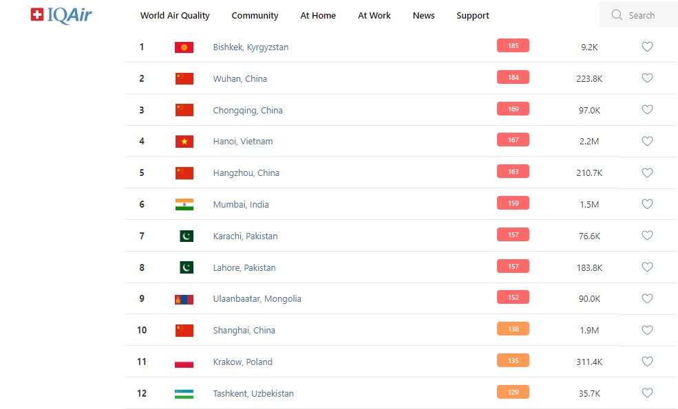 В рейтинге крупнейших городов мира по качеству воздуха World Air Quality Бишкек поднялся на первое место.
