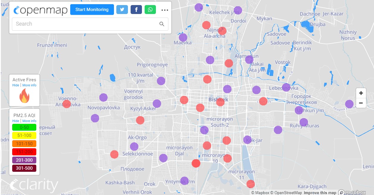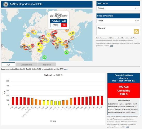 Посольство США в Кыргызстане также установило датчик. Информация обновляется каждый час. Индекс качества воздуха в районе дипломатической миссии — 167 (AQI).