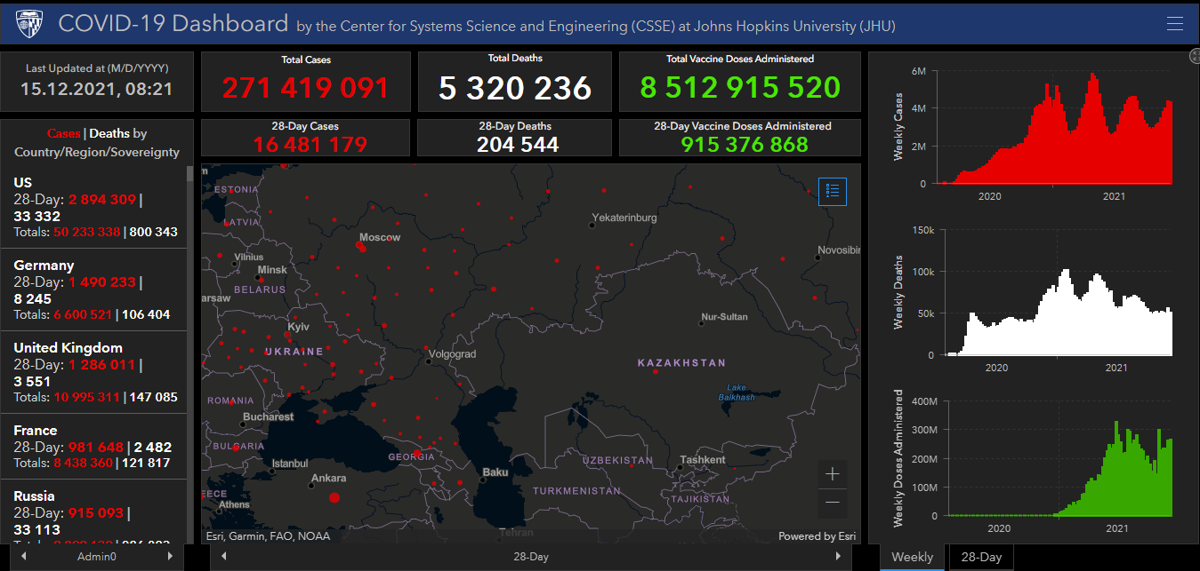 Всего в мире коронавирусом заразились 271 миллион 419 тысяч 91 человек. Больше всего зараженных в США (50 миллионов 233 тысячи 338), Индии (34 миллиона 703 тысячи 644), Бразилии (22 миллиона 195 тысяч 775), Франции (8 миллионов 438 тысяч 360), Великобритании (10 миллионов 995 тысяч 311), России (9 миллионов 899 тысяч 139), Турции (9 миллионов 82 тысячи 422), Аргентине (5 миллионов 366 тысяч 522), Иране (6 миллионов 160 тысяч 303), Колумбии (5 миллионов 97 тысяч 680), Испании (5 миллионов 366 тысяч 128), Италии (5 миллионов 258 тысяч 886) и Германии (6 миллионов 600 тысяч 521).