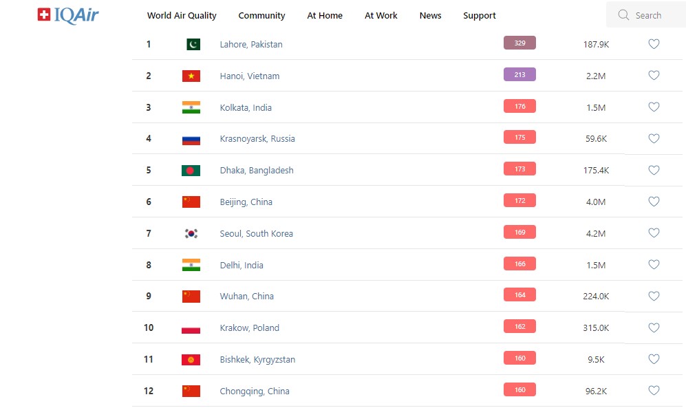 В рейтинге крупнейших городов мира по качеству воздуха World Air Quality Бишкек опустился на 11-е место.