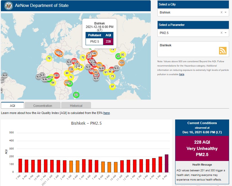 Посольство США в Кыргызстане также установило датчик. Информация обновляется каждый час. Индекс качества воздуха в районе дипломатической миссии — 228 (AQI).