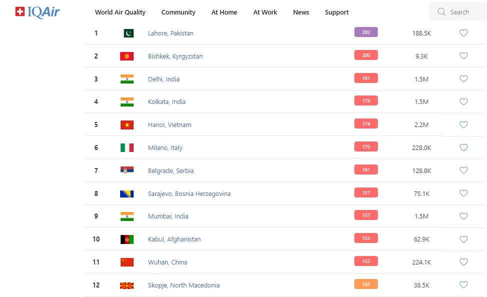 В рейтинге крупнейших городов мира по качеству воздуха World Air Quality Бишкек поднялся на второе место.