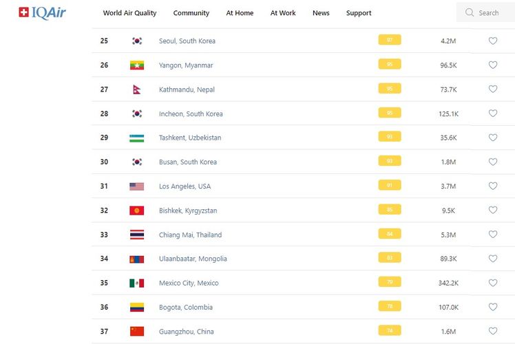 В рейтинге крупнейших городов мира по качеству воздуха World Air Quality Бишкек опустился на 32-е место.