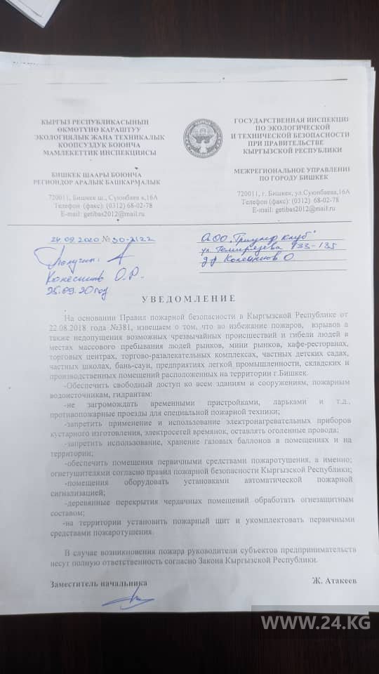 В Государственную инспекцию по экологической и технической безопасности поступило не одно письмо от жителей улицы Тимирязева с жалобой на ОсОО «Триумф клуб». Они просили проверить и закрыть кустарное производство.Начальник управления инспекции по пожарной безопасности по Бишкеку и Чуйской области Салмоорбек Карагулов отметил, что после обращения жителей Госэкотехинспекция неоднократно обращалась в Минэкономики с просьбой провести внеплановую проверку объекта. Все обращения министерство отклонило.