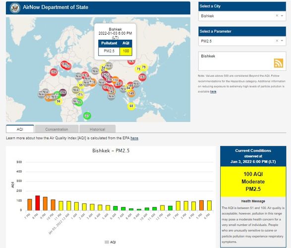 Посольство США в Кыргызстане также установило датчик. Информация обновляется каждый час. Индекс качества воздуха в районе дипломатической миссии — 100 (AQI).