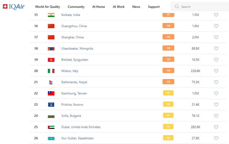 В рейтинге крупнейших городов мира по качеству воздуха World Air Quality Бишкек опустился на 19-е место.