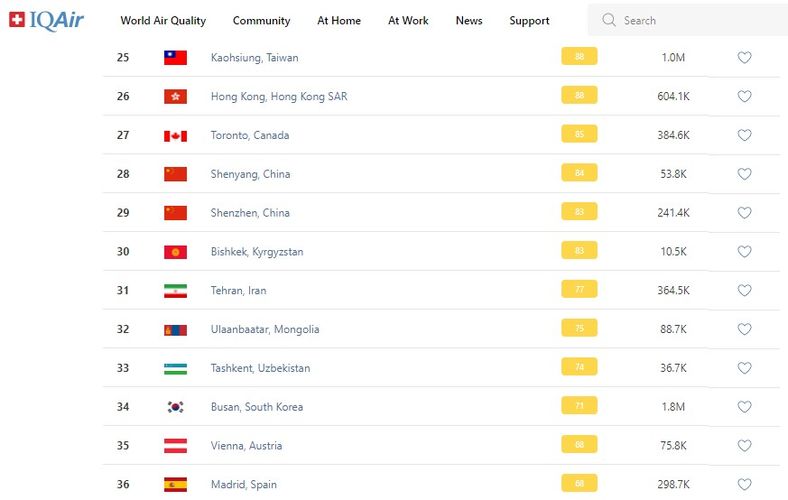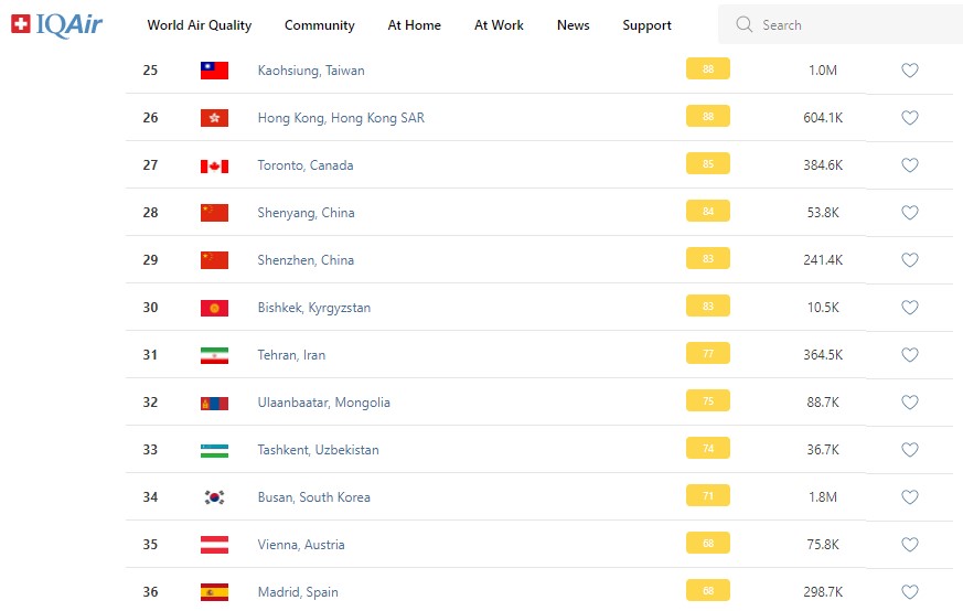 В рейтинге крупнейших городов мира по качеству воздуха World Air Quality Бишкек опустился на 30-е место.