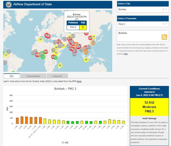 Посольство США в Кыргызстане также установило датчик. Информация обновляется каждый час. Индекс качества воздуха в районе дипломатической миссии — 52 (AQI).