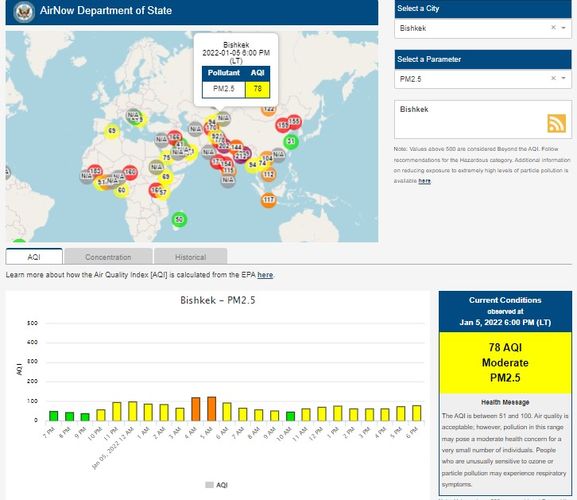 Посольство США в Кыргызстане также установило датчик. Информация обновляется каждый час. Индекс качества воздуха в районе дипломатической миссии — 78 (AQI).