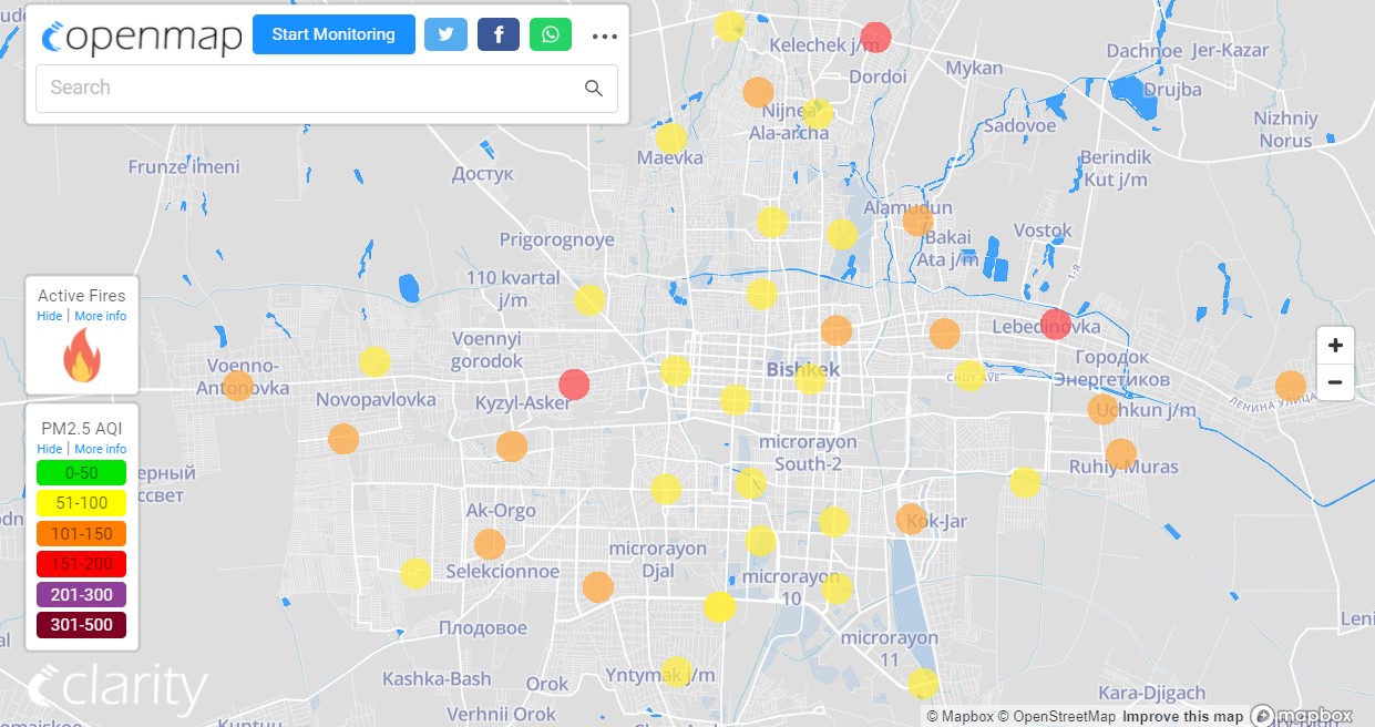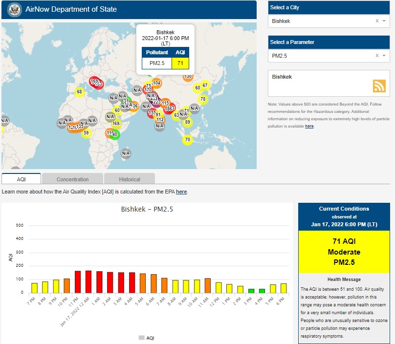 Посольство США в Кыргызстане также установило станцию. Информация обновляется каждый час. Индекс качества воздуха в районе дипломатической миссии — 71 (AQI).