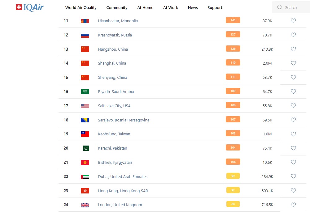 В рейтинге крупнейших городов мира по качеству воздуха World Air Quality Бишкек поднялся на 21-е место.