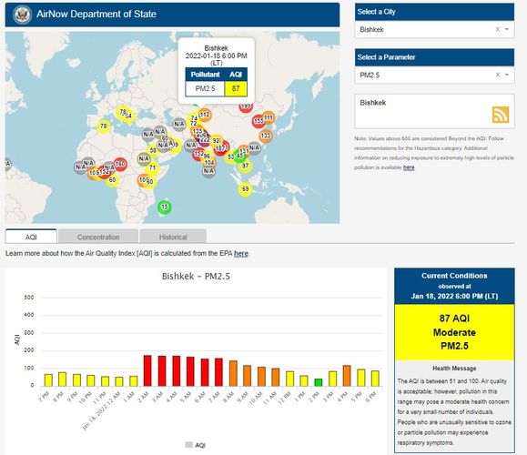 Посольство США в Кыргызстане также установило станцию. Информация обновляется каждый час. Индекс качества воздуха в районе дипломатической миссии — 87 (AQI).