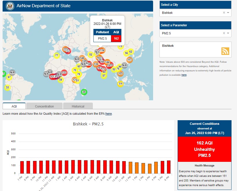 Посольство США в Кыргызстане также установило станцию. Информация обновляется каждый час. Индекс качества воздуха в районе дипломатической миссии — 162 (AQI).