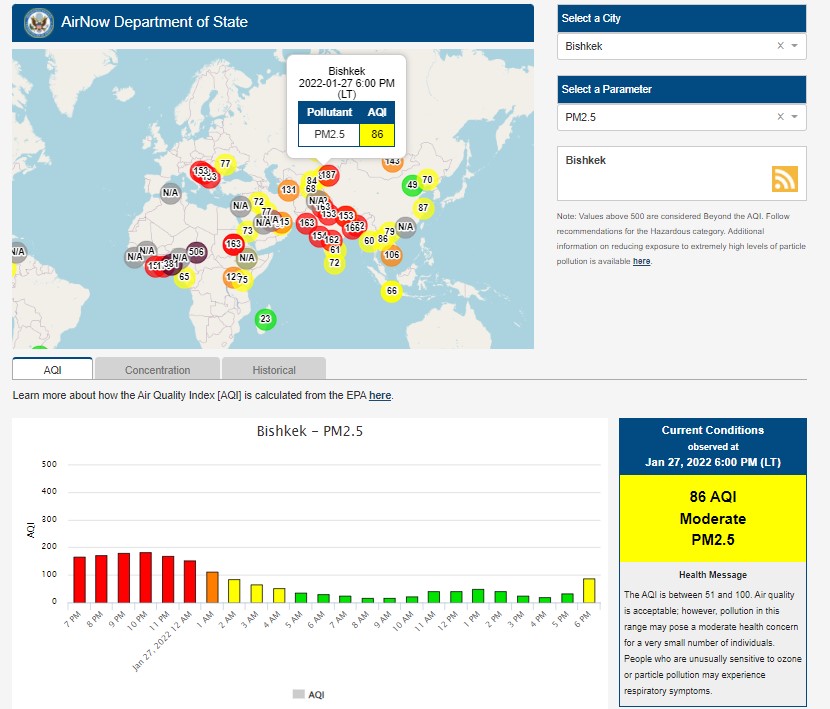 Посольство США в Кыргызстане также установило станцию. Информация обновляется каждый час. Индекс качества воздуха в районе дипломатической миссии — 86 (AQI).