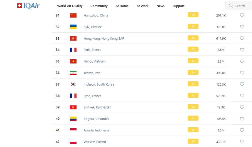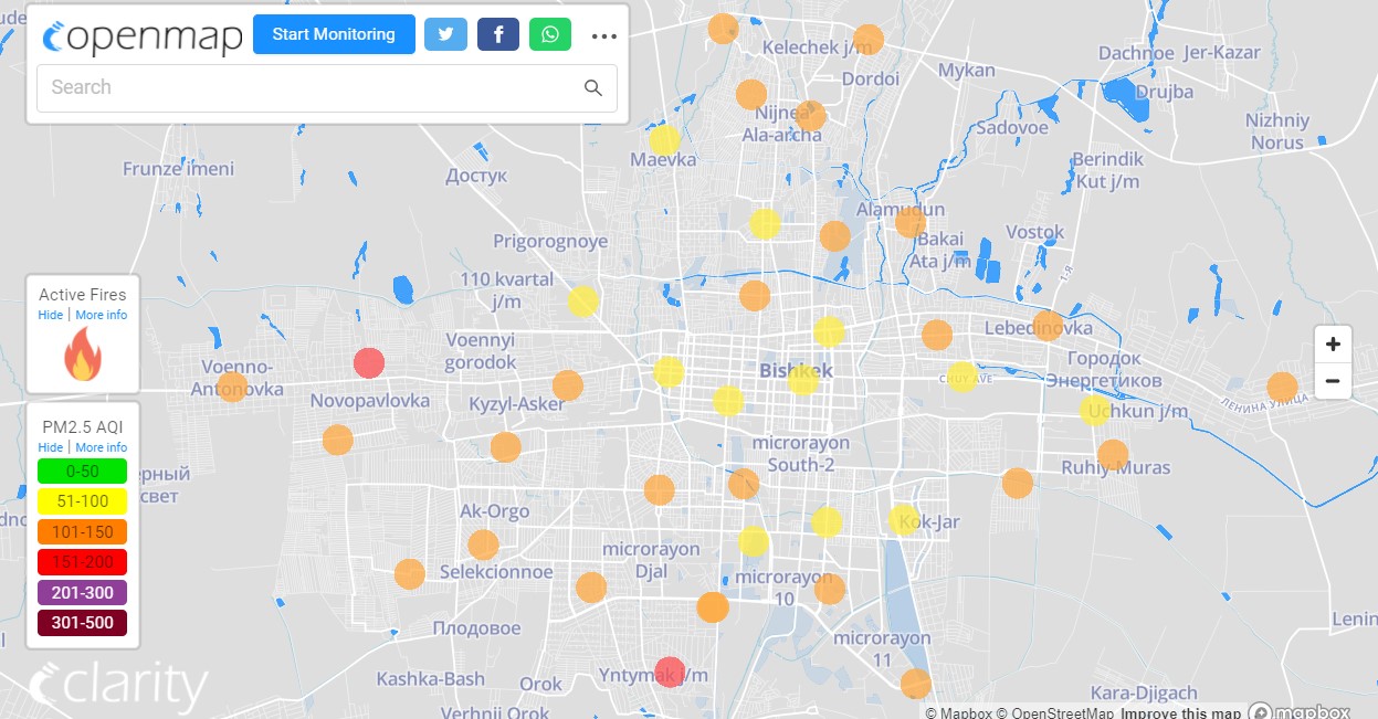 В рейтинге крупнейших городов мира по качеству воздуха World Air Quality Бишкек опустился на 39-е место.