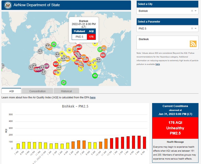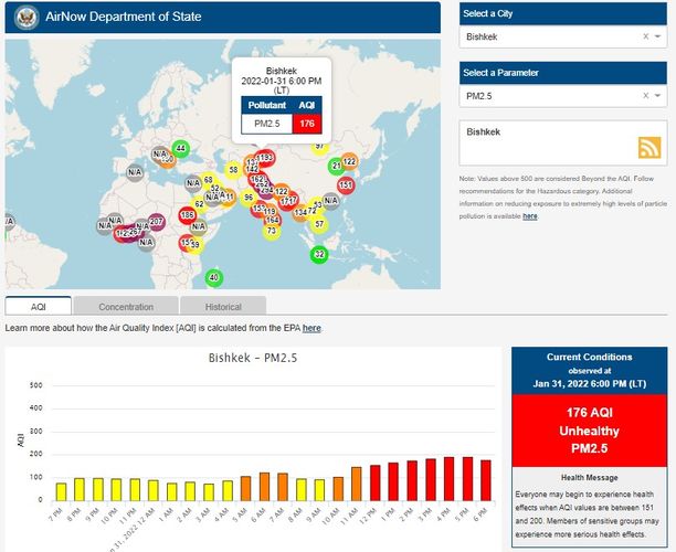 Посольство США в Кыргызстане также установило станцию. Информация обновляется каждый час. Индекс качества воздуха в районе дипломатической миссии — 176 (AQI).