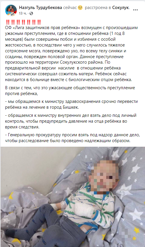 «Мы обращаемся к министру здравоохранения с просьбой перевести ребенка на лечение в город Бишкек. Обращаемся к министру внутренних дел с просьбой взять дело под личный контроль, чтобы предупредить давление на отца ребенка во время следствия. Генеральную прокуратуру просим взять под надзор данное дело, чтобы расследование было проведено надлежащим образом», — написала Назгуль Турдубекова.