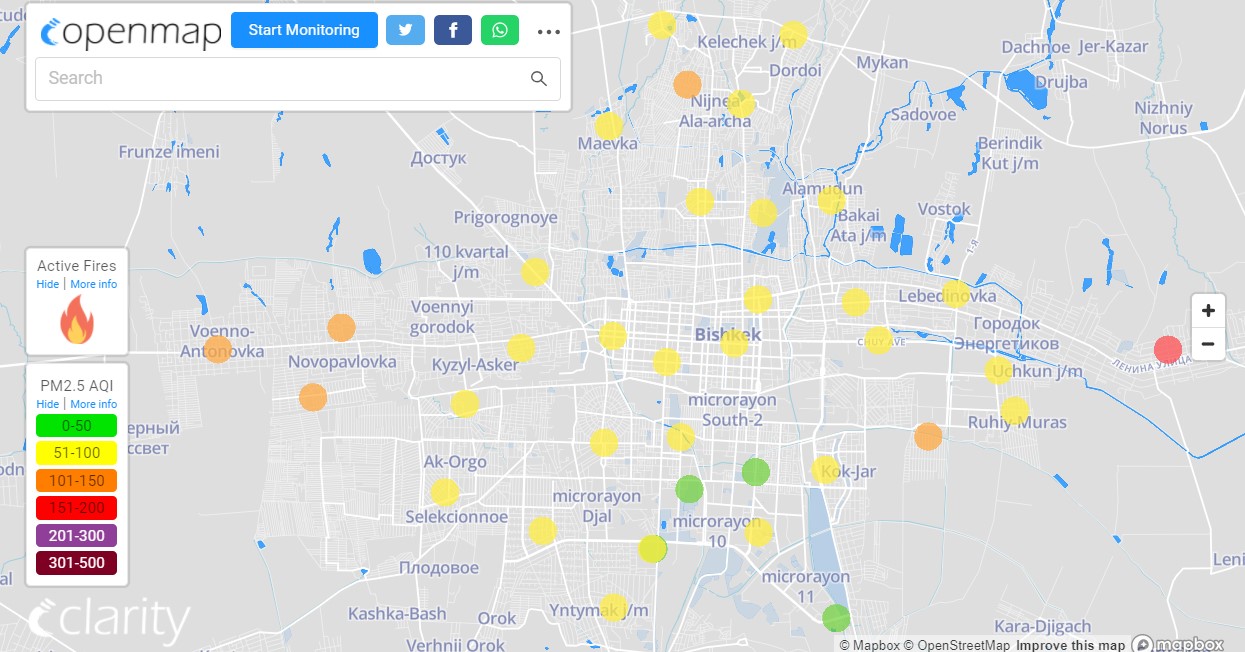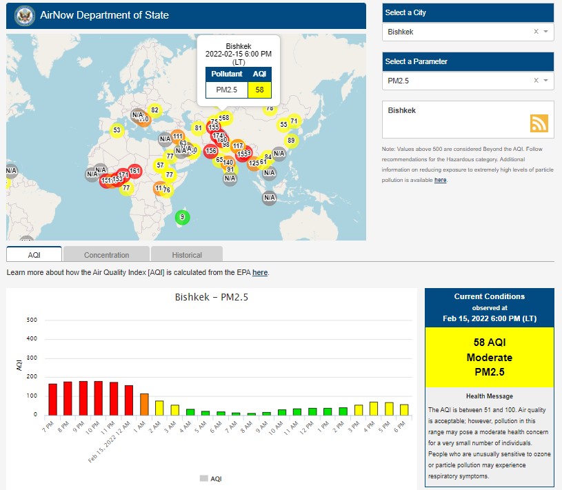 Посольство США в Кыргызстане также установило станцию. Информация обновляется каждый час. Индекс качества воздуха в районе дипломатической миссии — 58 (AQI).