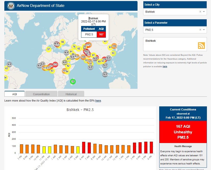 Посольство США в Кыргызстане также установило станцию. Информация обновляется каждый час. Индекс качества воздуха в районе дипломатической миссии — 167 (AQI).