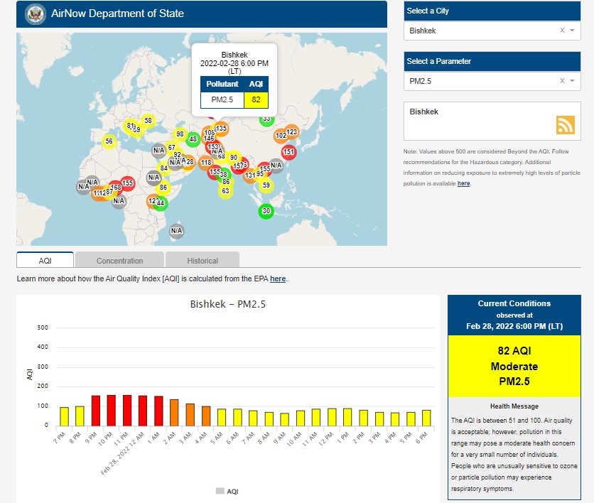 Посольство США в Кыргызстане также установило станцию. Информация обновляется каждый час. Индекс качества воздуха в районе дипломатической миссии — 82 (AQI).