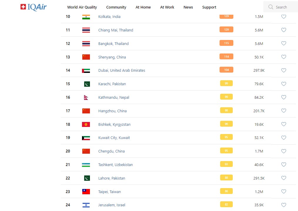 В рейтинге крупнейших городов мира по качеству воздуха World Air Quality Бишкек поднялся на 18-е место.