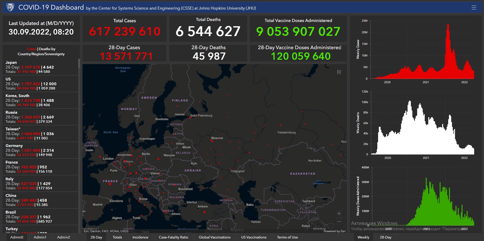 Всего в мире с начала пандемии коронавирусом заразились 617 миллионов 239 тысяч 610 человек. Больше всего в США (96 миллионов 346 тысяч 995), Индии (44 миллиона 580 тысяч 771), Бразилии (34 миллиона 654 тысячи 190), Франции (35 миллионов 560 тысяч 24), Великобритании (23 миллиона 893 тысячи 351), России (20 миллионов 648 тысяч 73), Турции (16 миллионов 873 тысячи 793), Аргентине (9 миллионов 708 тысяч 420), Иране (7 миллионов 548 тысяч 320), Колумбии (6 миллионов 307 тысяч 372), Испании (13 миллионов 412 тысяч 263), Италии (22 миллиона 432 тысячи 803) и Германии (33 миллиона 312 тысяч 373).