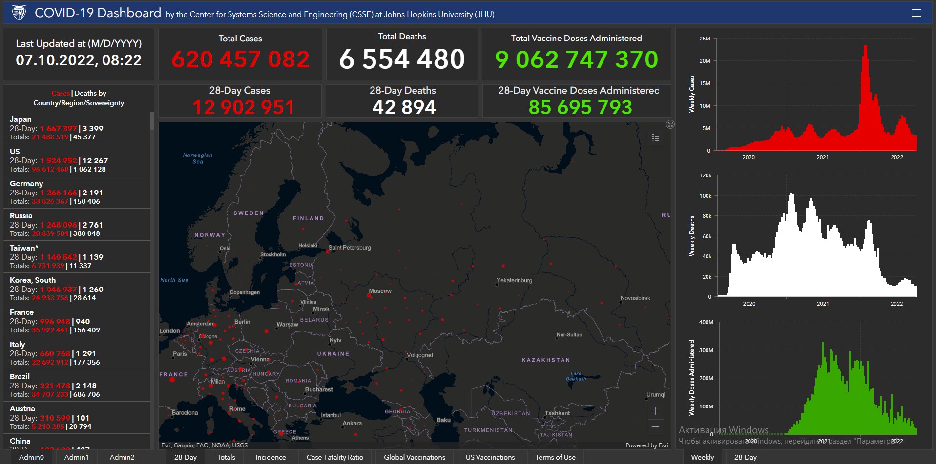 Всего в мире с начала пандемии коронавирусом заразились 620 миллионов 457 тысяч 82 человека. Больше всего в США (96 миллионов 612 тысяч 468), Индии (44 миллиона 601 тысяча 872), Бразилии (34 миллиона 707 тысяч 233), Франции (35 миллионов 922 тысячи 441), Великобритании (23 миллиона 956 тысяч 680), России (20 миллионов 839 тысяч 504), Турции (16 миллионов 873 тысячи 793), Аргентине (9 миллионов 711 тысяч 355), Иране (7 миллионов 550 тысяч 856), Колумбии (6 миллионов 308 тысяч 87), Испании (13 миллионов 431 тысяча 98), Италии (22 миллиона 692 тысячи 912) и Германии (33 миллиона 826 тысяч 367).