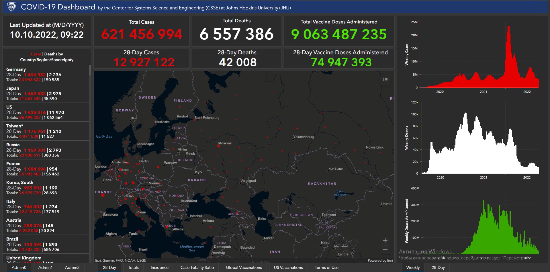 Всего в мире с начала пандемии коронавирусом заразились 621 миллион 456 тысяч 994 человека. Больше всего в США (96 миллионов 699 тысяч 237), Индии (44 миллиона 612 тысяч 13), Бразилии (34 миллиона 707 тысяч 233), Франции (35 миллионов 983 тысячи 605), Великобритании (23 миллиона 957 тысяч 310), России (20 миллионов 900 тысяч 611), Турции (16 миллионов 896 тысяч 522), Аргентине (9 миллионов 713 тысяч 594), Иране (7 миллионов 551 тысяча 680), Колумбии (6 миллионов 308 тысяч 87), Испании (13 миллионов 441 тысяча 941), Италии (22 миллиона 815 тысячи 736) и Германии (33 миллиона 948 тысяч 632).