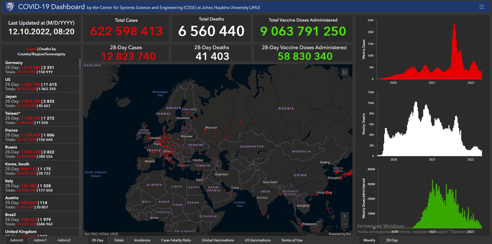 Всего в мире с начала пандемии коронавирусом заразились 622 миллиона 598 тысяч 413 человек. Больше всего в США (96 миллионов 772 тысячи 268), Индии (44 миллиона 613 тысяч 803), Бразилии (34 миллиона 731 тысяча 539), Франции (36 миллионов 187 тысяч 658), Великобритании (23 миллиона 957 тысяч 457), России (20 миллионов 929 тысяч 929), Турции (16 миллионов 919 тысяч 638), Аргентине (9 миллионов 713 тысяч 594), Иране (7 миллионов 552 тысячи 812), Колумбии (6 миллионов 308 тысяч 87), Испании (13 миллионов 441 тысяча 941), Италии (22 миллиона 896 тысяч 742) и Германии (34 миллиона 257 тысяч 916).