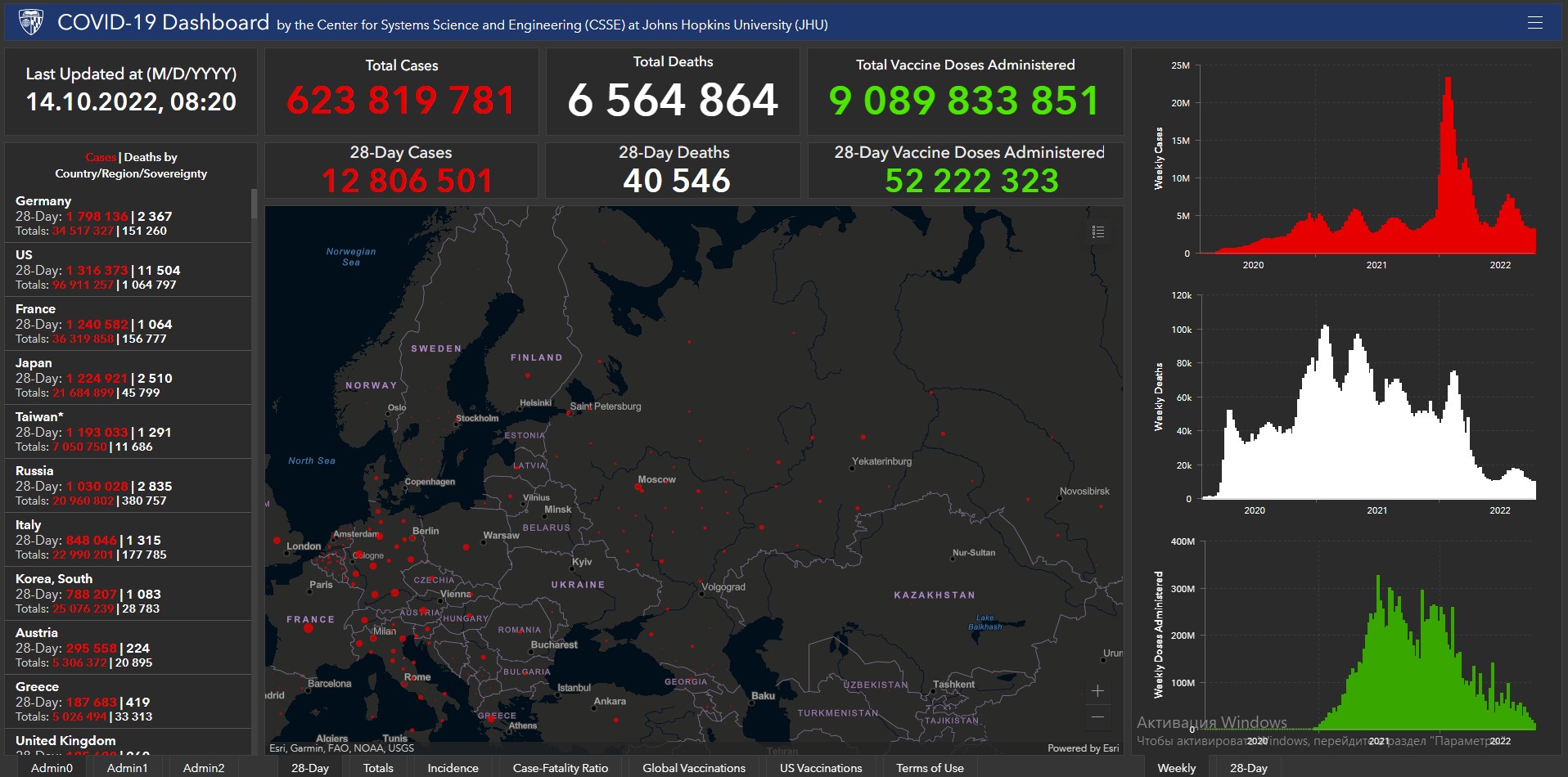 Всего в мире с начала пандемии коронавирусом заразились 623 миллиона 819 тысяч 781 человек. Больше всего в США (96 миллионов 911 тысяч 257), Индии (44 миллиона 618 тысяч 727), Бразилии (34 миллиона 739 тысяч 865), Франции (36 миллионов 319 тысяч 858), Великобритании (24 миллиона 21 тысяча 294), России (20 миллионов 960 тысяч 802), Турции (16 миллионов 919 тысяч 638), Аргентине (9 миллионов 713 тысяч 594), Иране (7 миллионов 553 тысячи 454), Колумбии (6 миллионов 308 тысяч 558), Испании (13 миллионов 441 тысяча 941), Италии (22 миллиона 990 тысяч 201) и Германии (34 миллиона 517 тысяч 327).
