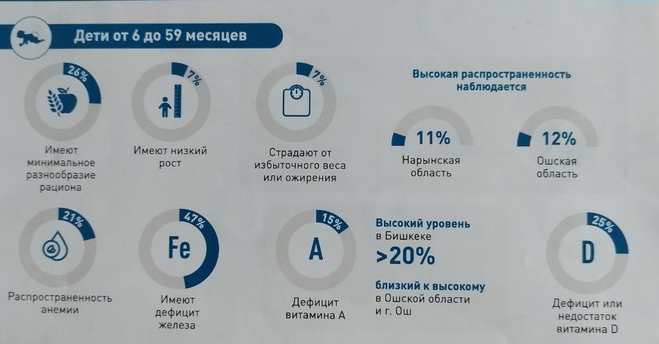 В Бишкеке презентовали результаты первого национального комплексного исследования состояния питания детей и женщин. Анализ выявил тревожный уровень анемии, дефицита железа и фолиевой кислоты, нехватку витаминов А и D. Дети имеют низкий рост или, напротив, как и взрослые, страдают от ожирения.«Дефицит железа, например, особенно опасен в первые пять лет жизни. Именно в этом возрасте происходит формирование головного мозга, а соответственно, и когнитивное развитие, — рассказала журналистам доктор медицинских наук, профессор, специалист по питанию Турсун Мамырбаева. — От дефицита железа у ребенка будет страдать концентрация внимания, память, логическое мышление. Ясно, что такой ребенок на занятиях будет отставать в интеллектуальном развитии. Это будет проявляться в каких-то жизненных ситуациях». Восполнить эти пробелы позднее не получится, ведь головной мозг уже сформирован.