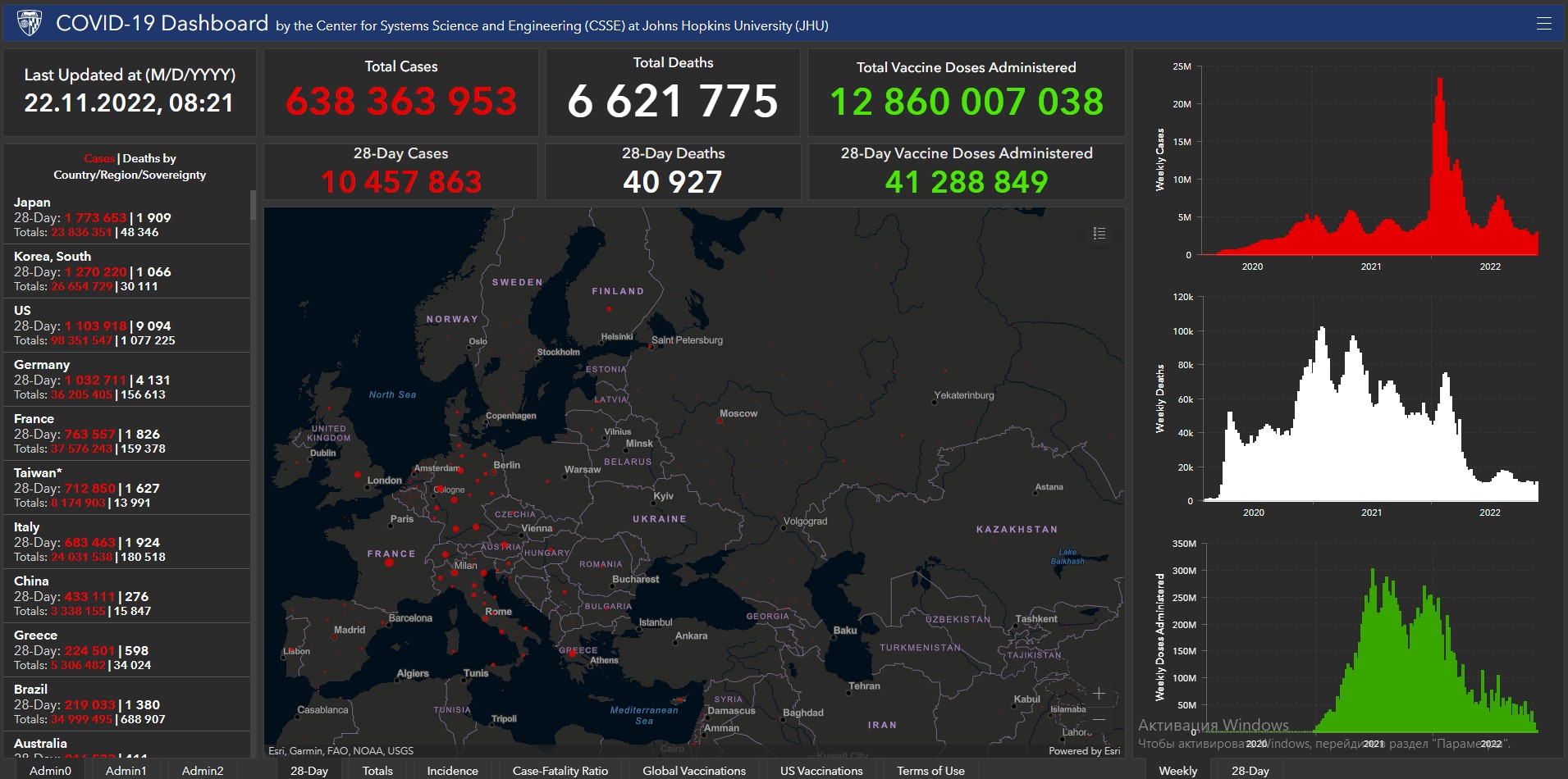 Всего в мире с начала пандемии коронавирусом заразились 638 миллионов 363 тысячи 953 человека. Больше всего в США (98 миллионов 351 тысяча 547), Индии (44 миллиона 669 тысяч 421), Бразилии (34 миллиона 999 тысяч 495), Франции (37 миллионов 576 тысяч 243), Великобритании (24 миллиона 203 тысячи 873), России (21 миллион 234 тысячи 988), Турции (16 миллионов 919 тысяч 638), Аргентине (9 миллионов 723 тысячи 924), Иране (7 миллионов 559 тысяч 368), Колумбии (6 миллионов 312 тысяч 657), Испании (13 миллионов 573 тысячи 721), Италии (24 миллиона 31 тысяча 538) и Германии (36 миллионов 205 тысяч 405).