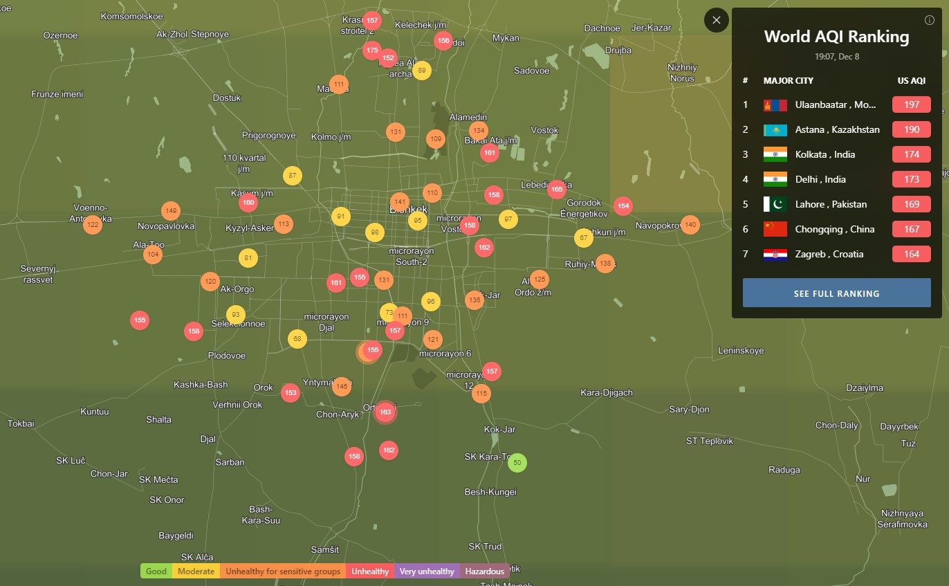 В рейтинге крупнейших городов мира по качеству воздуха World Air Quality Бишкек находится на 16-м месте.