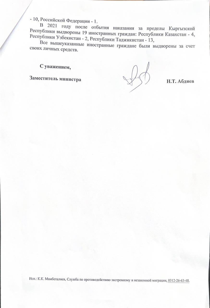 В ответе на запрос депутата, подписанном заместителем министра внутренних дел Нурбеком Абдиевым, указывается, что журналист выдворен за пределы республики за счет средств республиканского бюджета 23 ноября в 20.00 авиарейсом «Бишкек — Москва» компании «Авиа Трафик Компании». Сообщается, что из страны в этом году депортировали 13 иностранцев, в 2021-м — 19. Все они депортированы за свой счет.