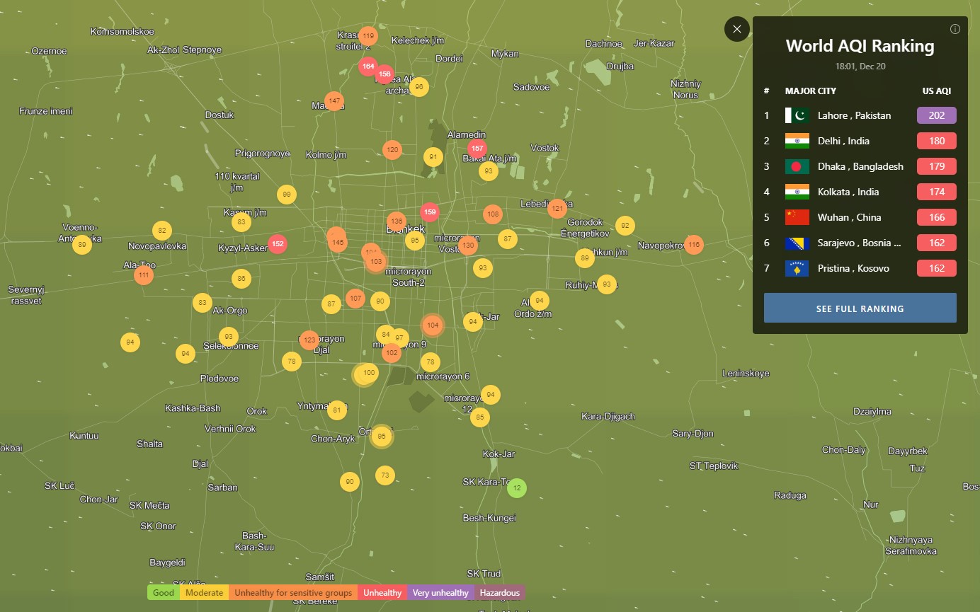 В рейтинге крупнейших городов мира по качеству воздуха World Air Quality Бишкек опустился на 29-е место.