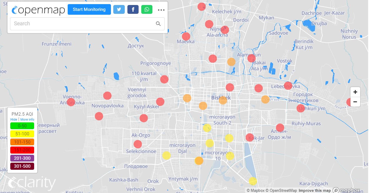 Посольство США в Кыргызстане также установило станцию. Информация обновляется каждый час. Индекс качества воздуха в районе дипломатической миссии «нездоровый для чувствительных групп» — 111 (AQI).