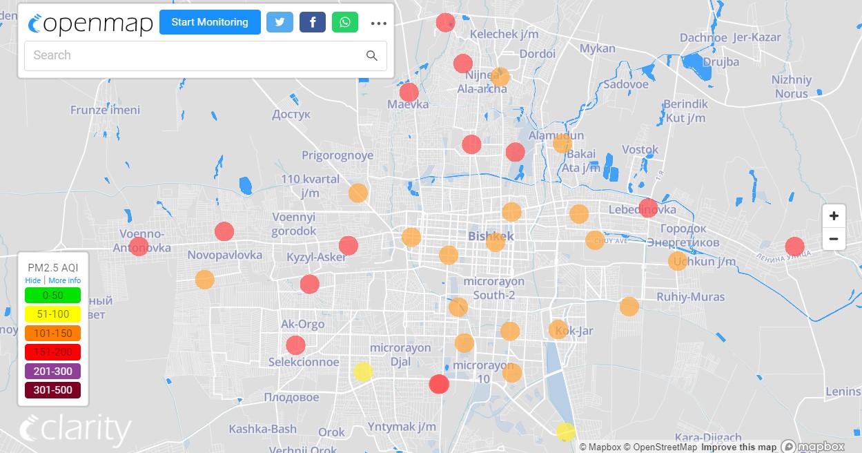 Посольство США в Кыргызстане также установило станцию. Информация обновляется каждый час. Индекс качества воздуха в районе дипломатической миссии «нездоровый» — 159 (AQI).