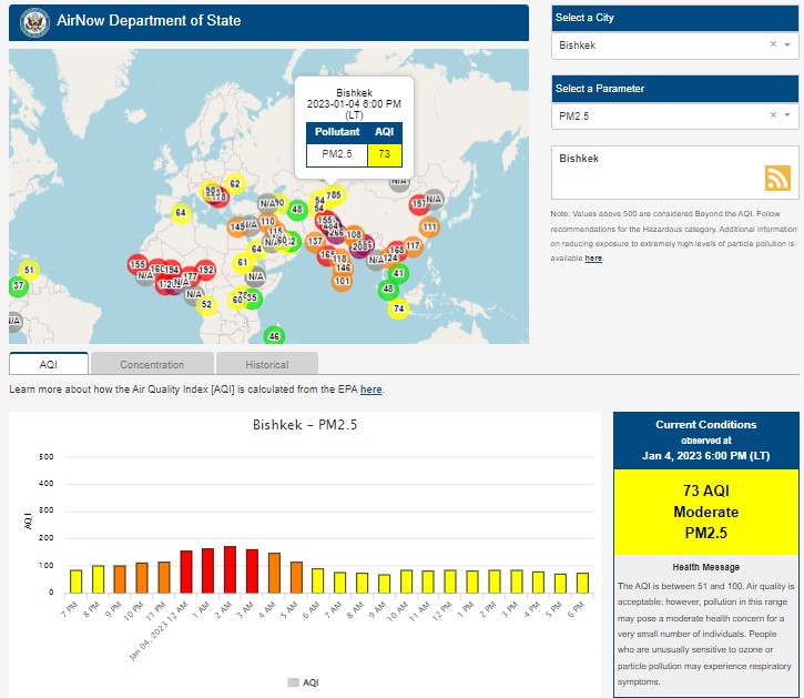 Посольство США в Кыргызстане также установило станцию. Информация обновляется каждый час. Индекс качества воздуха в районе дипломатической миссии «умеренный» — 73 (AQI).